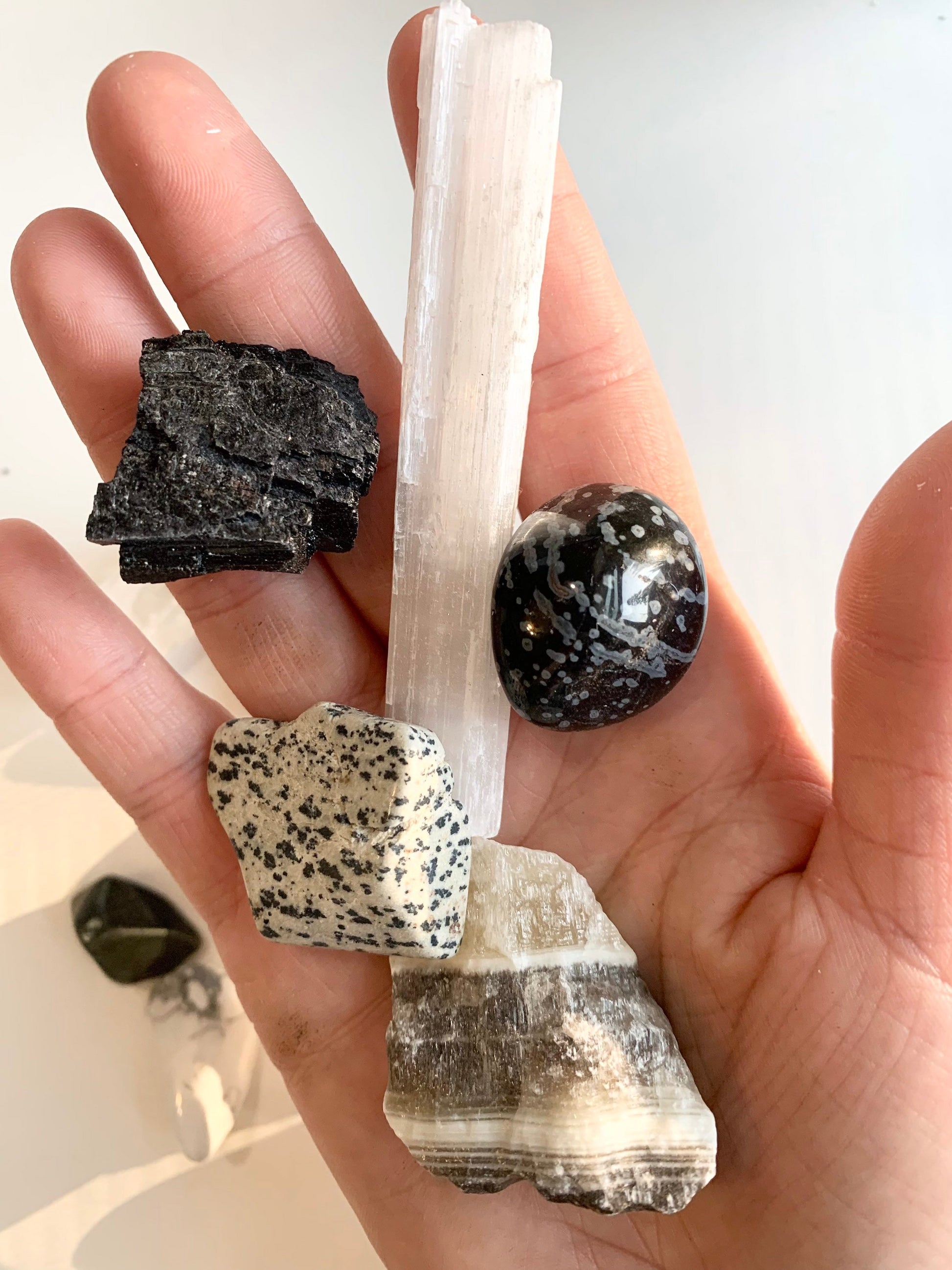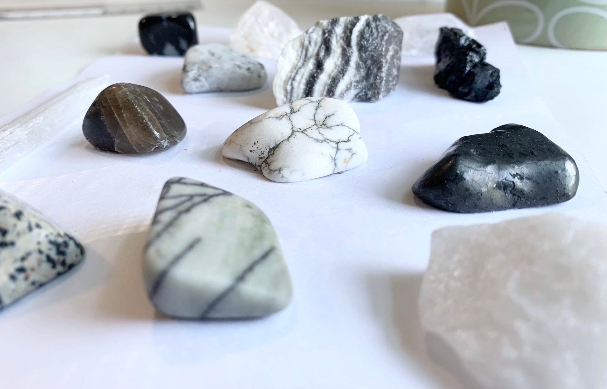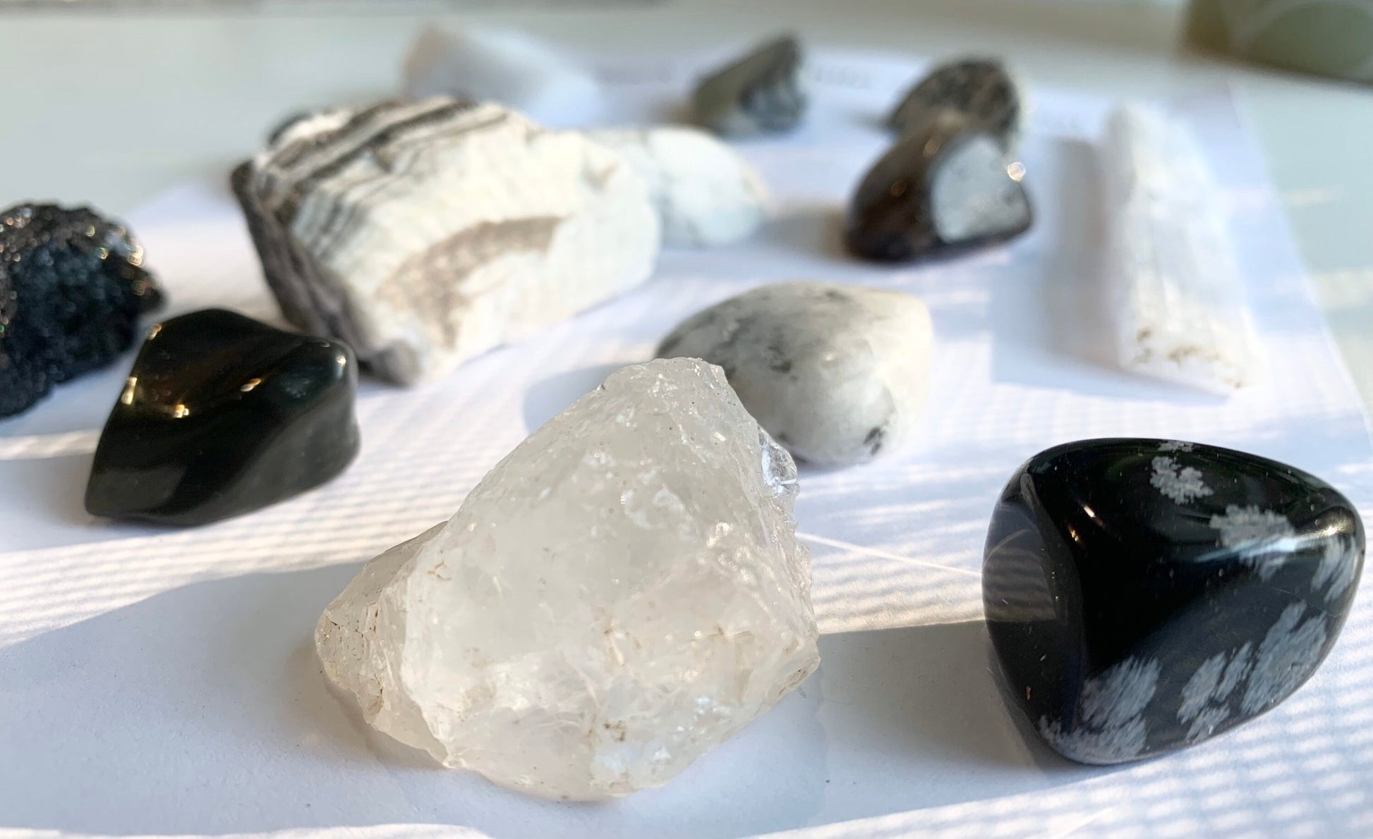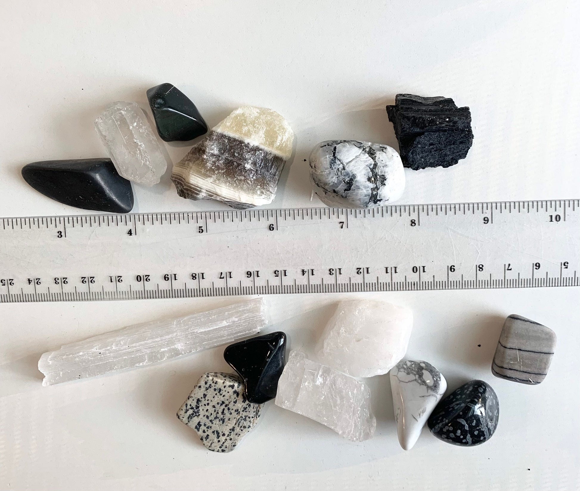 This is a set of 14 black and white stones featuring a stunning combination of rough and polished stones in the set!