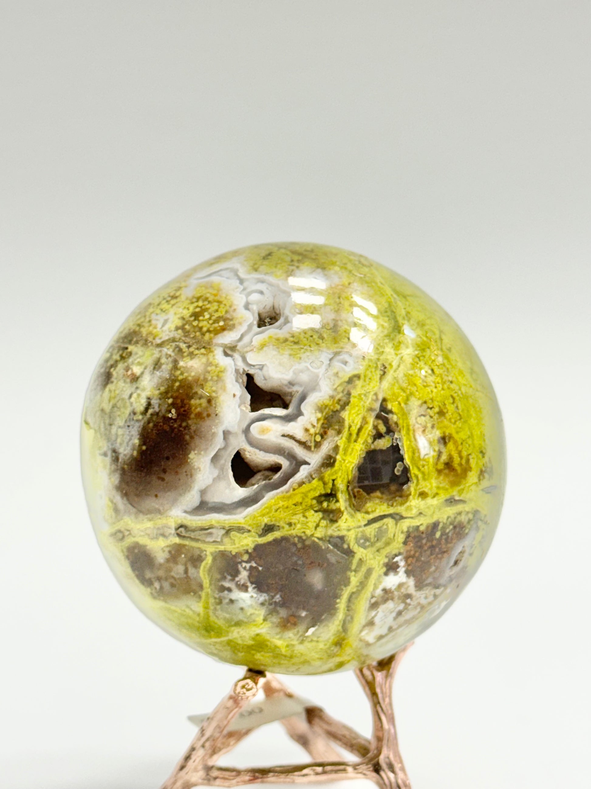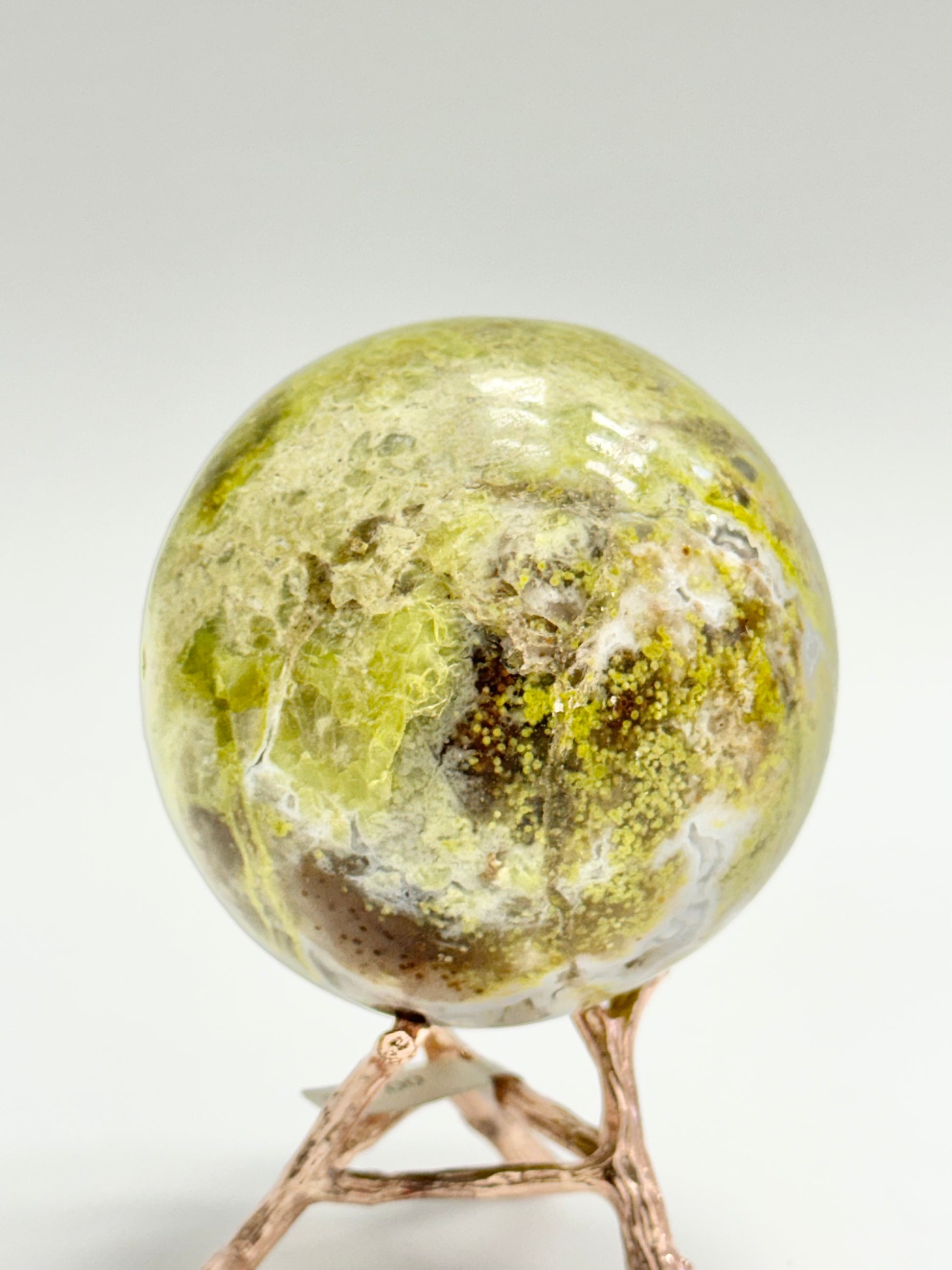 This ~73mm Green Opal Sphere features a natural druzy vug pocket that adds beautiful depth and shimmer. A perfect statement piece for shelves, altars, or any crystal display.