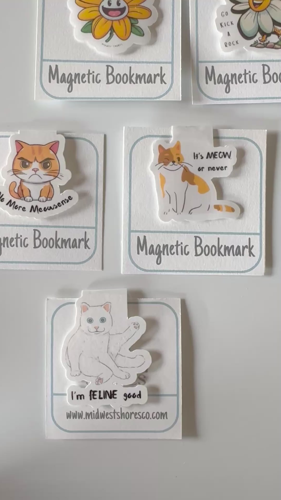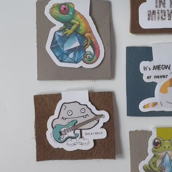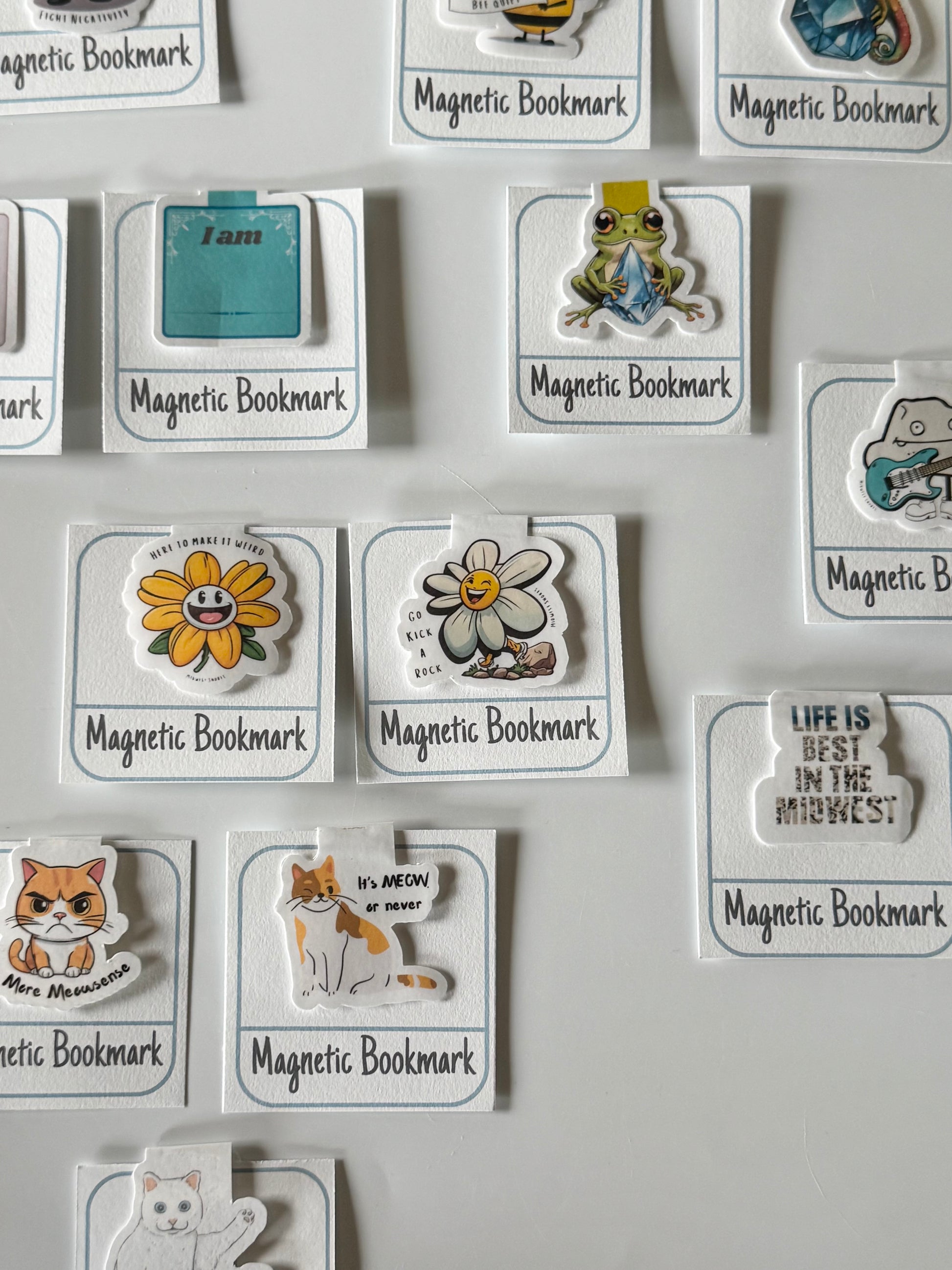 These magnetic bookmarks are a fun and charming way to save your place in any book. Each design brings its own personality—whether it’s a crystal-loving chameleon, a cozy cat, a rock-and-roll pebble, a shining gemstone, a proud Wisconsin outline, a sweet little frog, or a Midwest-inspired quote. They fold over the page with a secure magnetic hold, so they won’t slip out while you read. Perfect for students, book lovers, planners, or anyone who enjoys a little extra joy tucked between the pages.