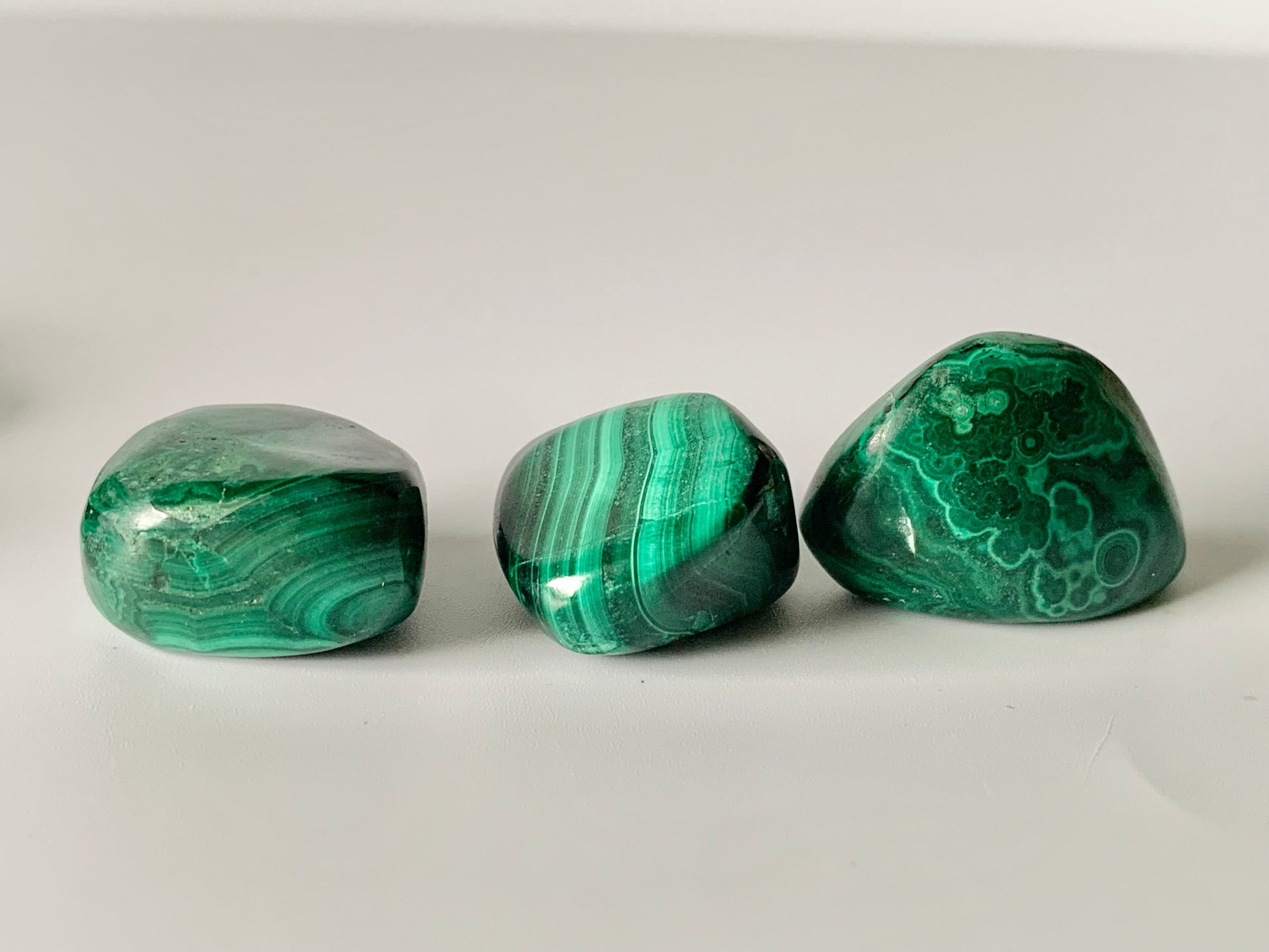 Bright and bold, the piercing green color of malachite is irresistible. When tumbled into pieces at times you are able to differentiate what used to be velvety or bubbly!