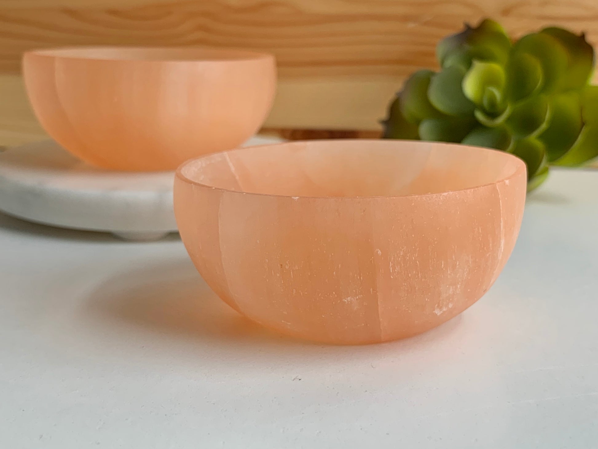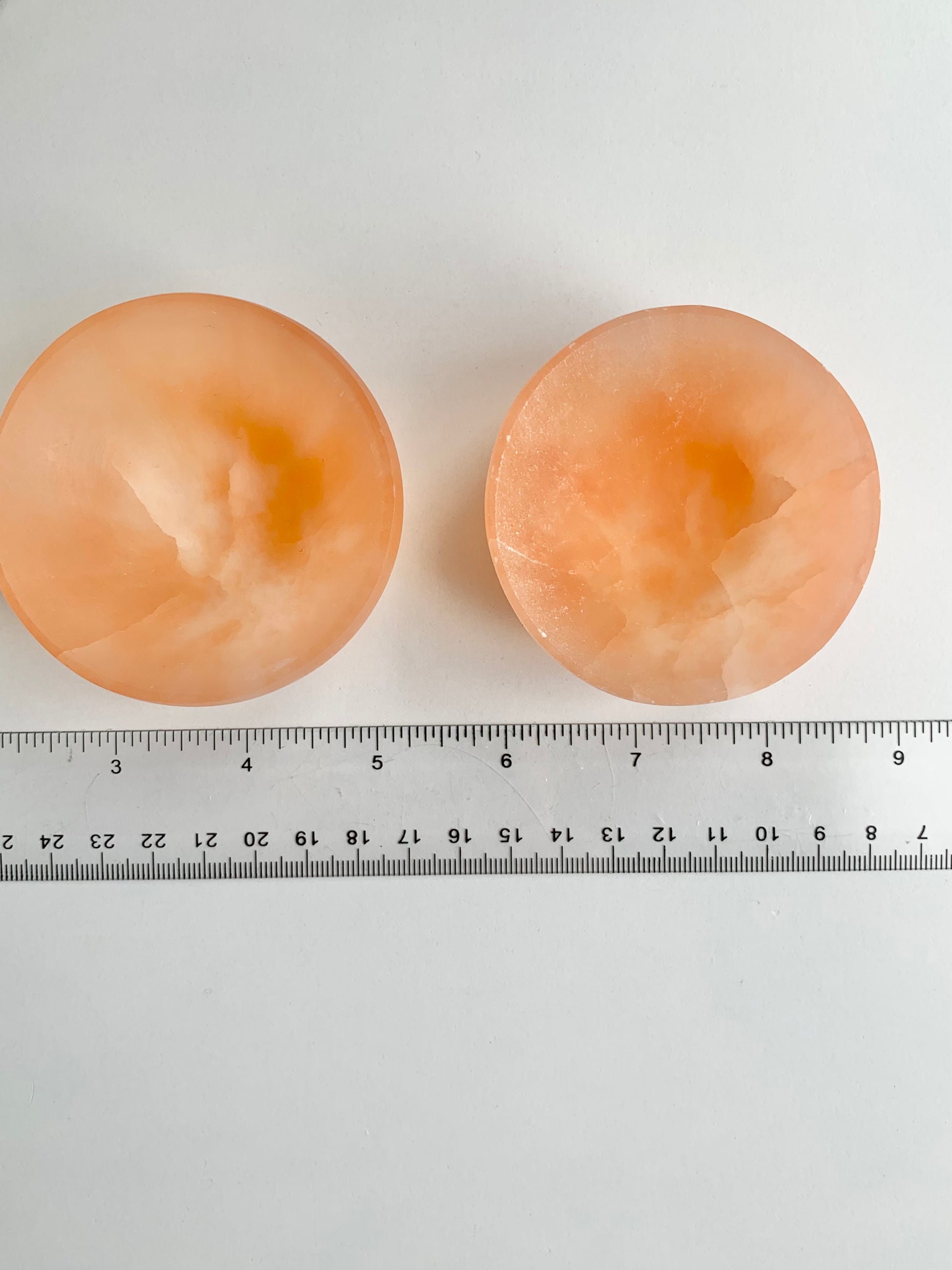 These peach satin spar bowls (often called selenite), are approximately 3” across. We think they are perfect to hold tumbles and other small treasures.