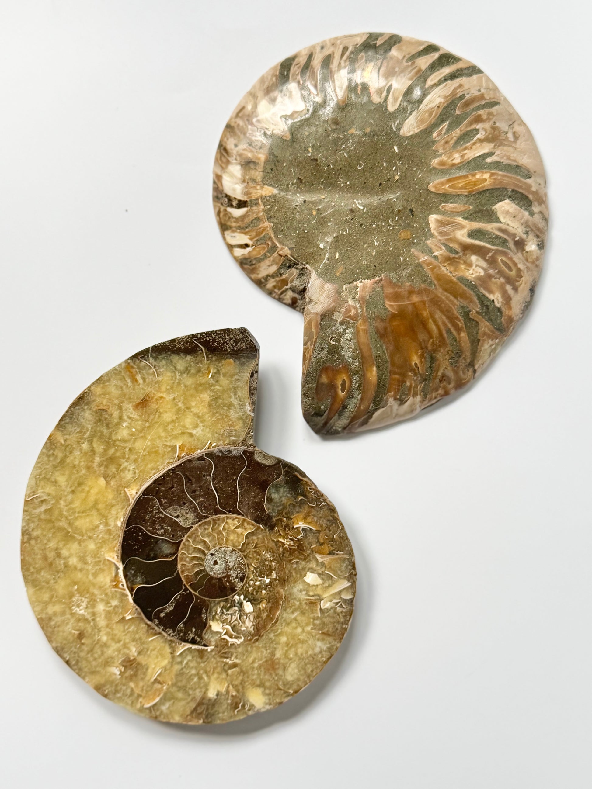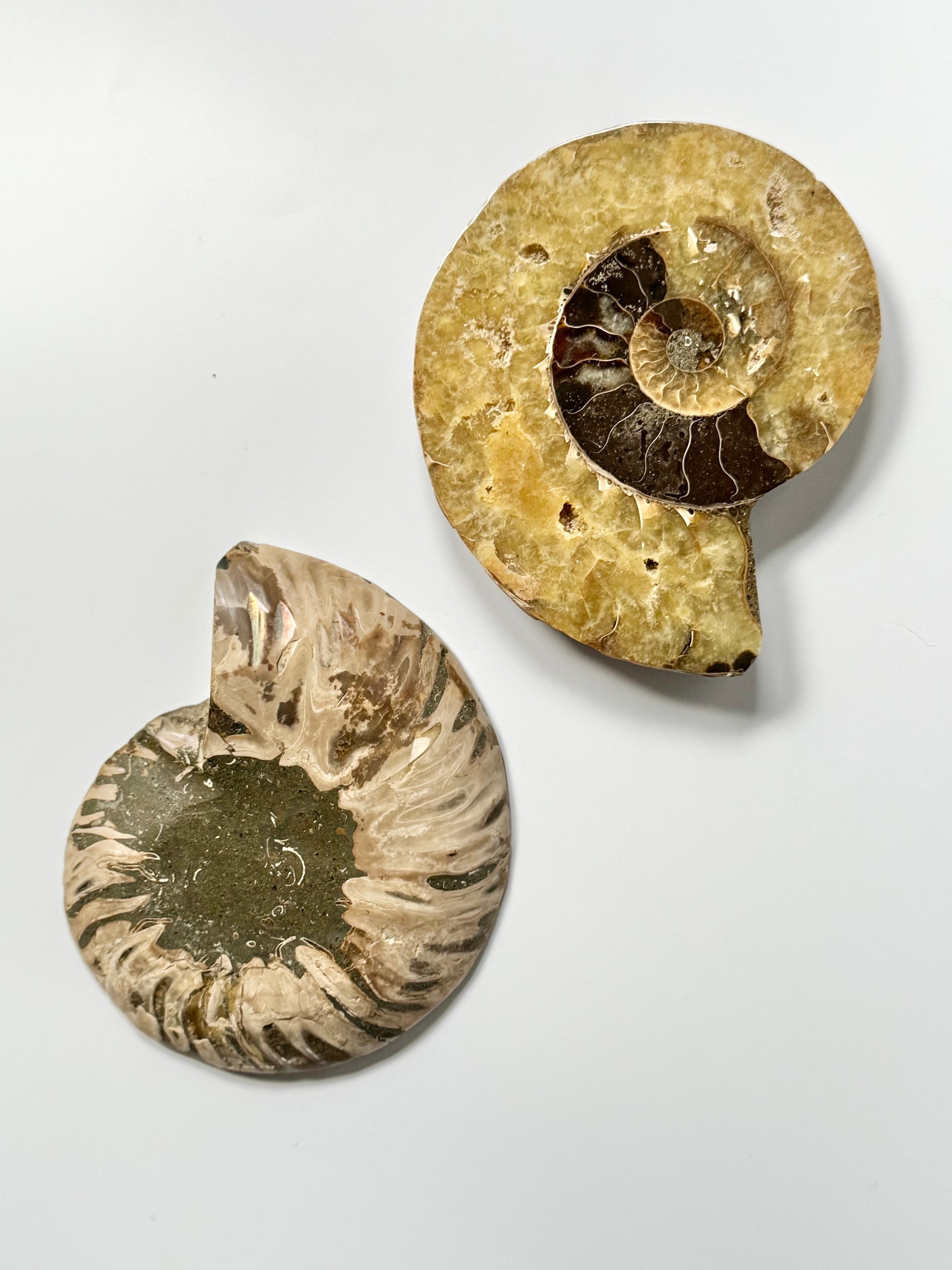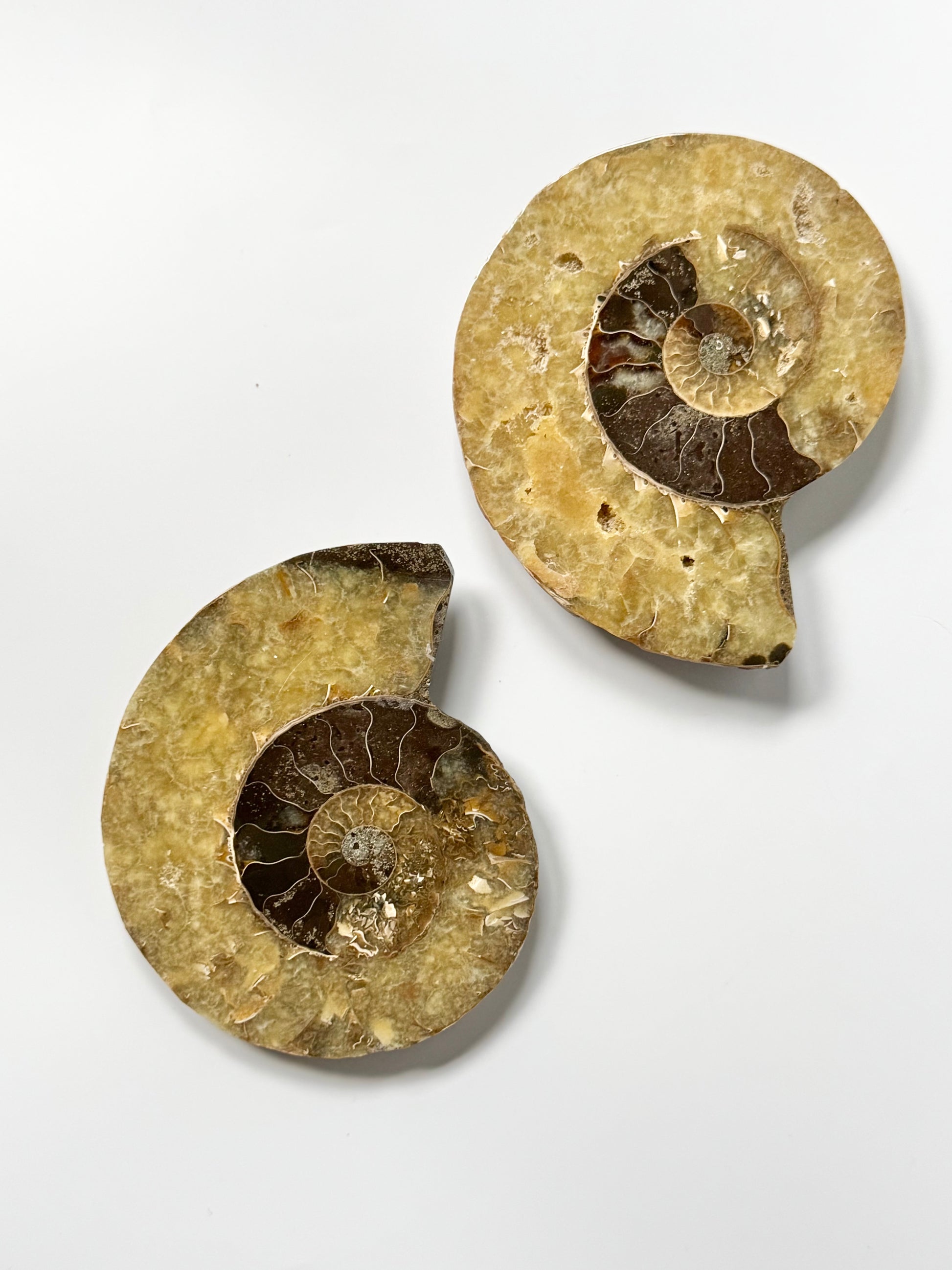 Over 65 million years old, each spiral tells a story of transformation, movement, and natural beauty. The polish reveals intricate inner chambers and subtle shimmer, while the mirrored pair makes it perfect for display, energy work, or simply marveling at nature’s artistry.