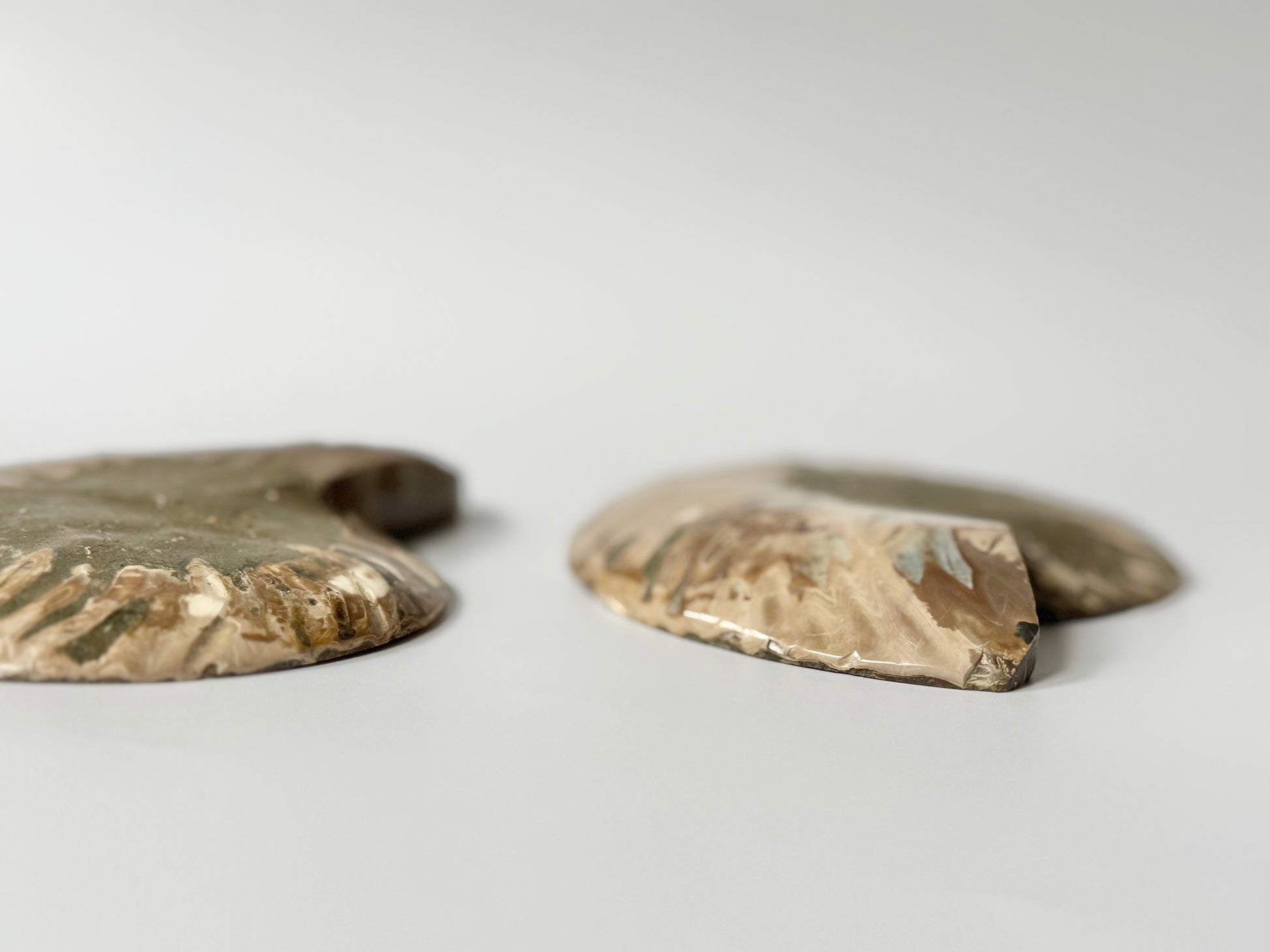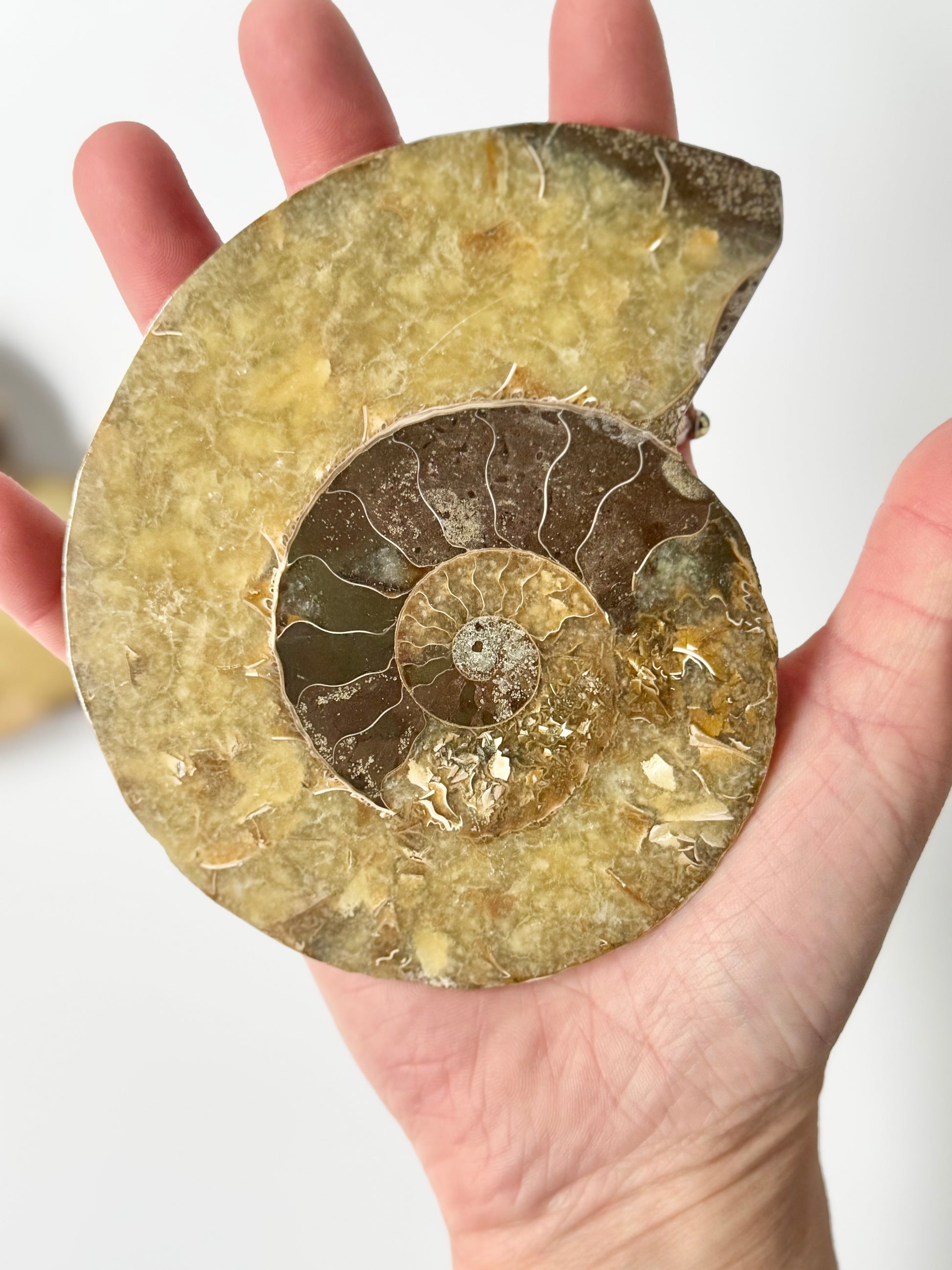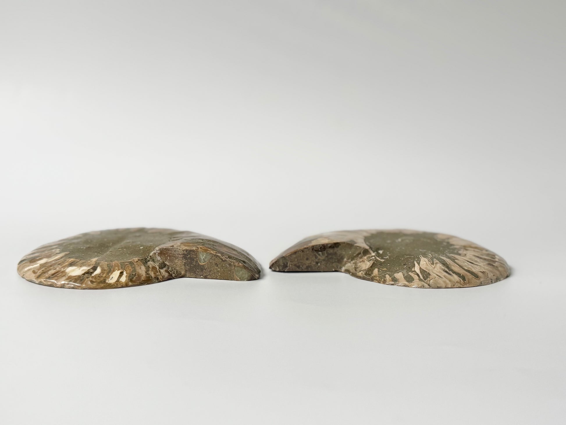 Over 65 million years old, each spiral tells a story of transformation, movement, and natural beauty. The polish reveals intricate inner chambers and subtle shimmer, while the mirrored pair makes it perfect for display, energy work, or simply marveling at nature’s artistry.