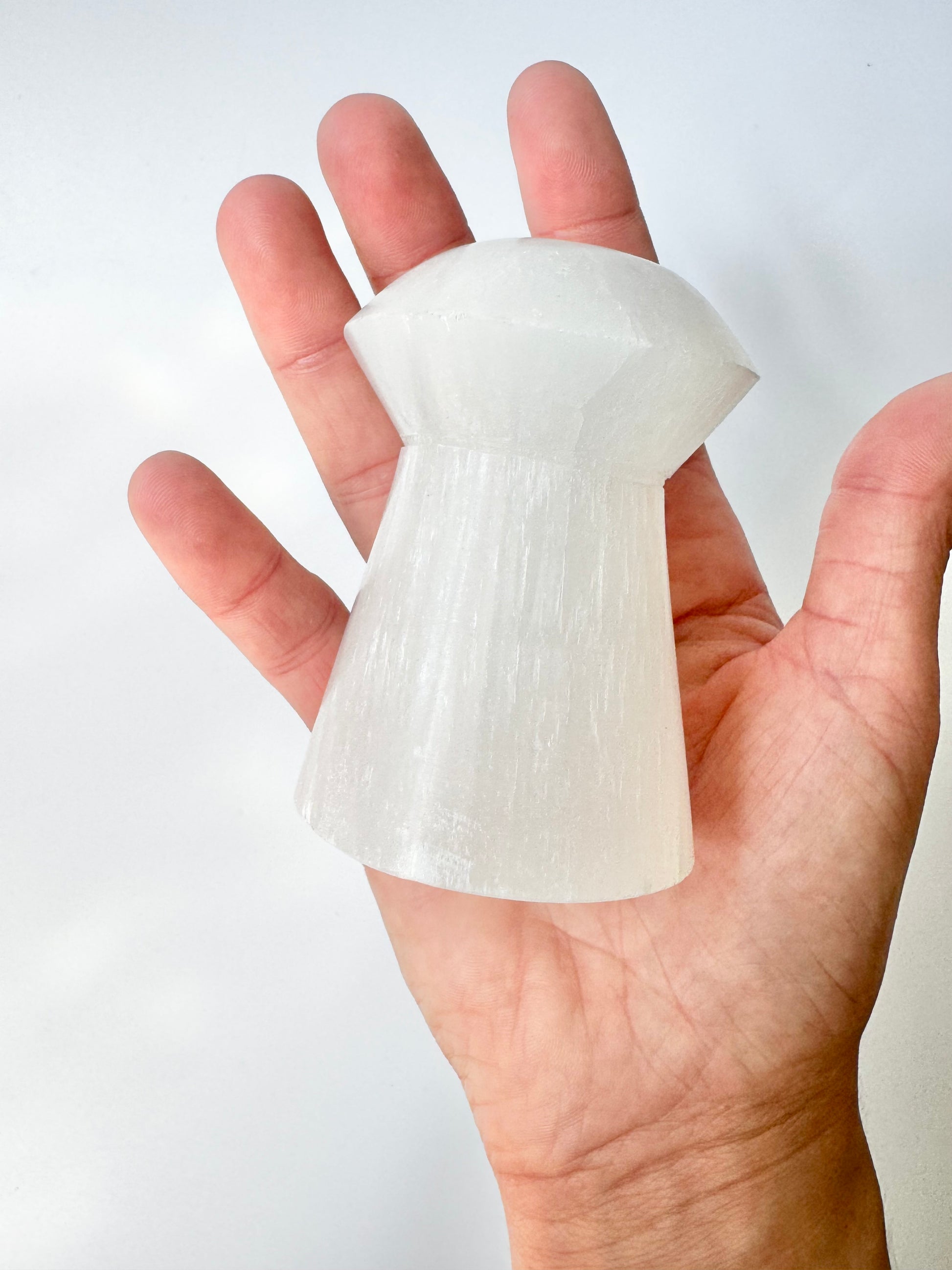 The detailing, silky white lines, cats eye effect, and uniqueness of the satin spar make these mushroom crystal carvings a great addition to anyones collection.
