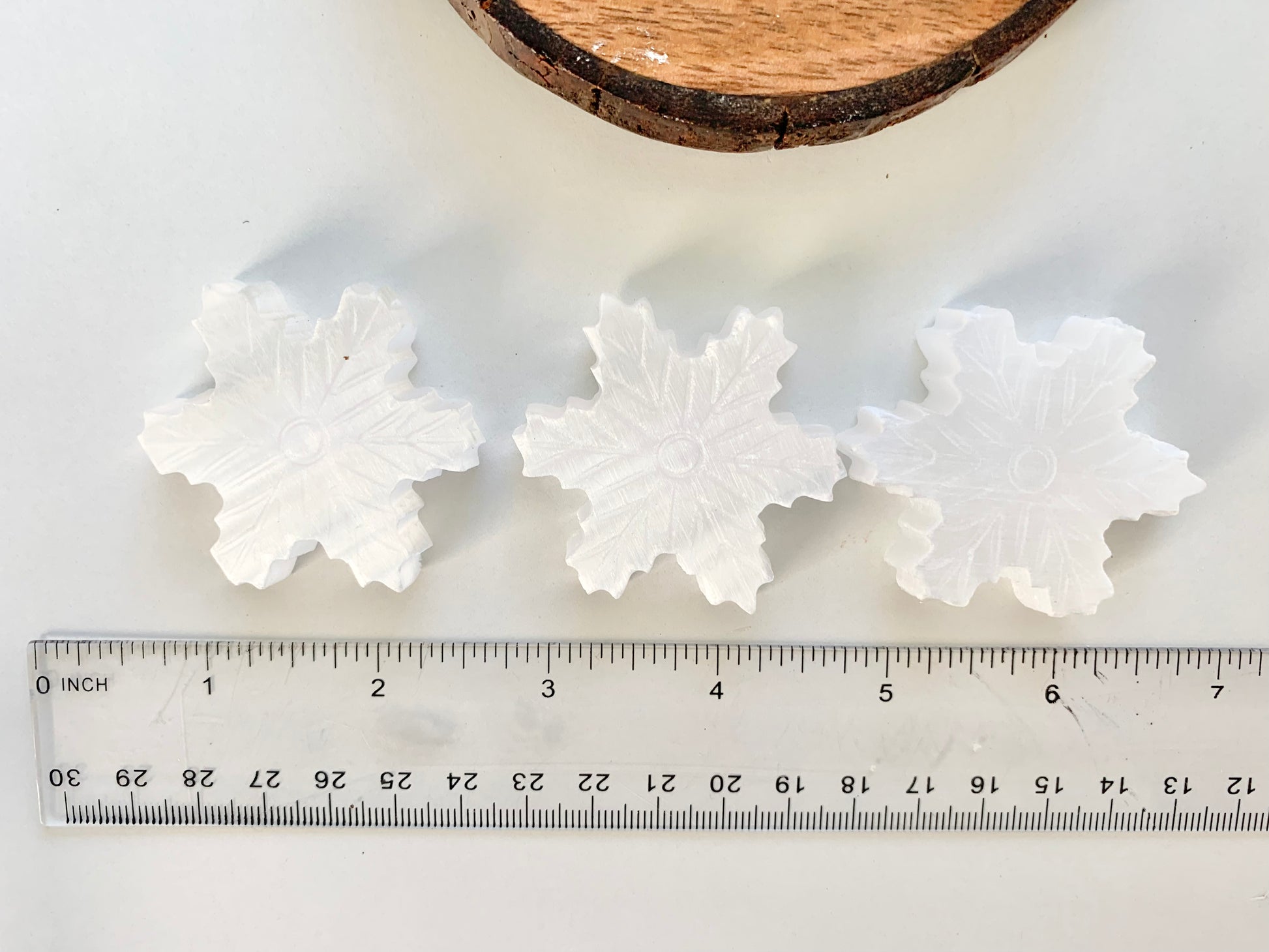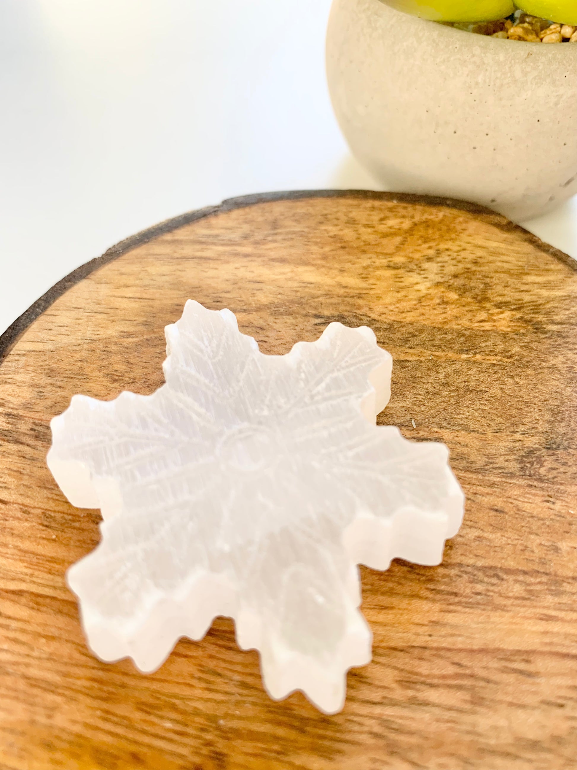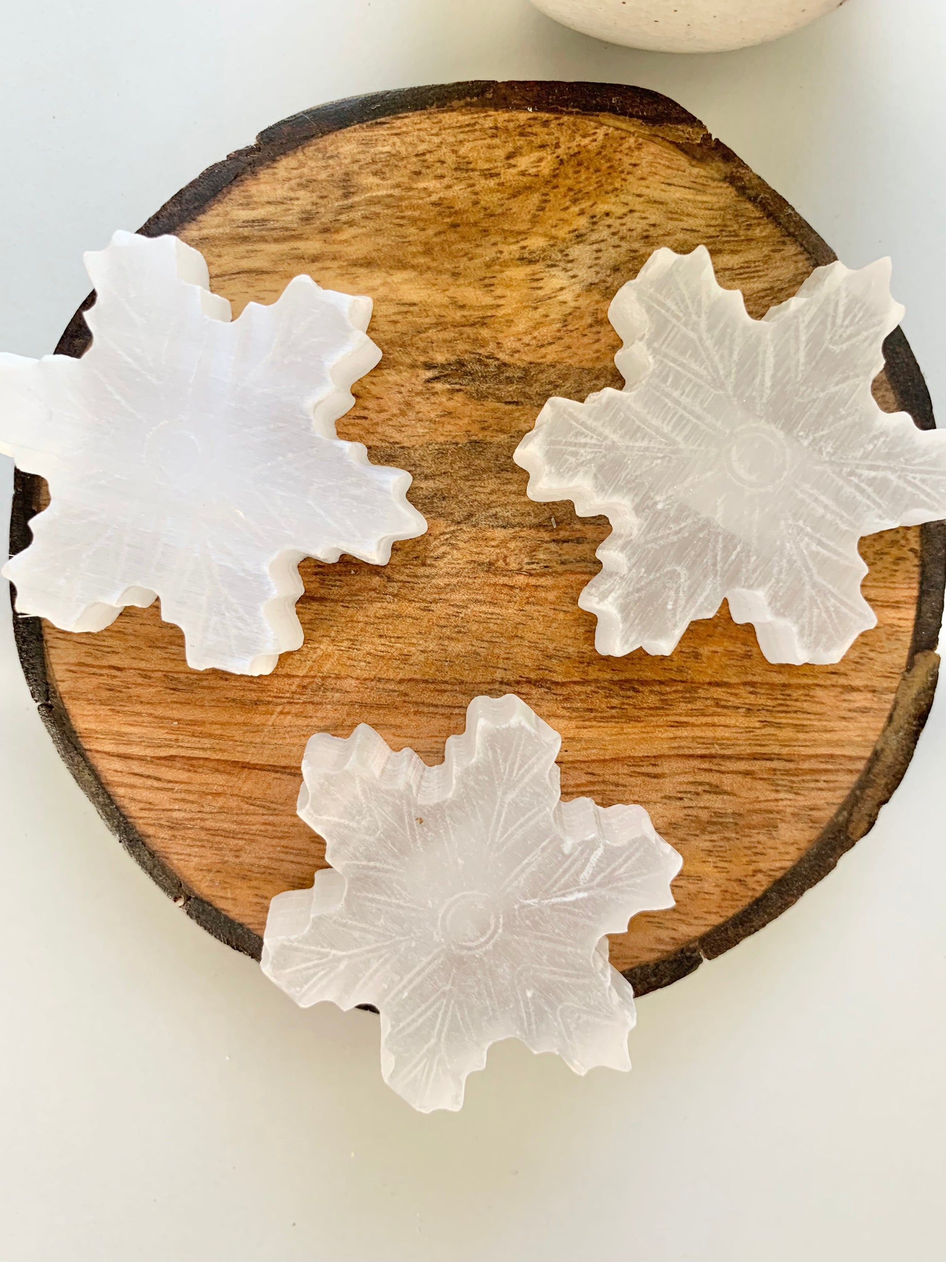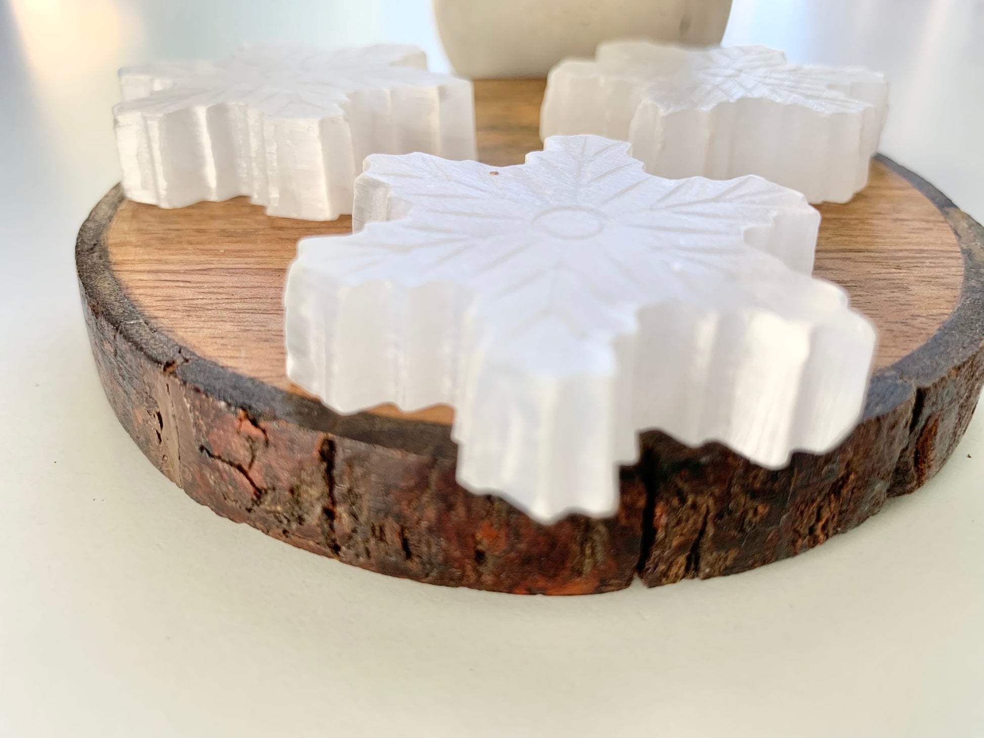 Snowflakes alone are a work of art, combine it with a mineral, crystal like satin spar and you get a lovely display piece. The small snow flakes are such a great addition to enjoy the season in your office or home. Pair with little gnomes (which we have!) and with fairy lights.