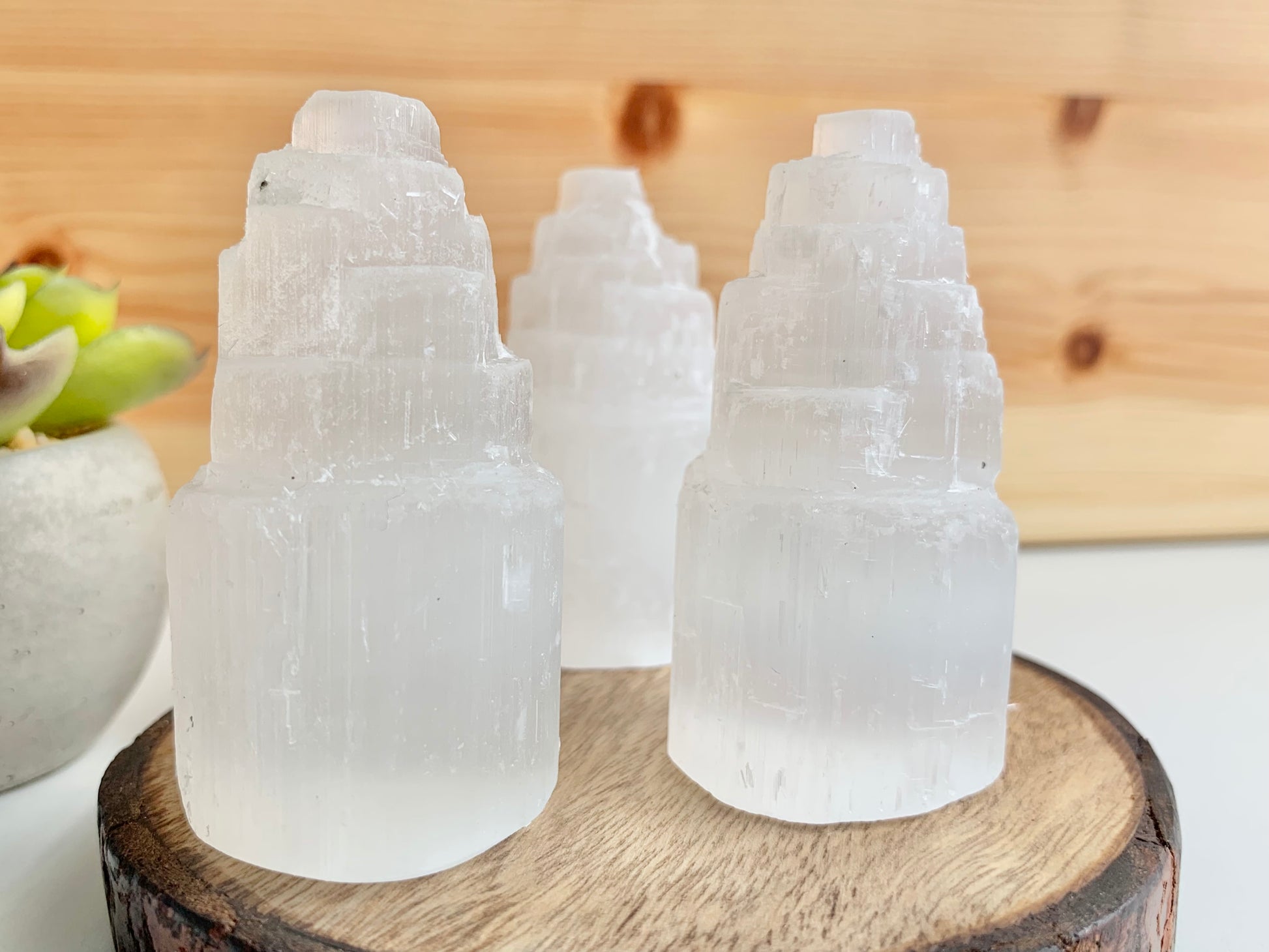 Satin spar towers, commonly called selenite, can serve several purposes. We love to put them on our light bases since they capture light so well, or use them as bracelet holders.